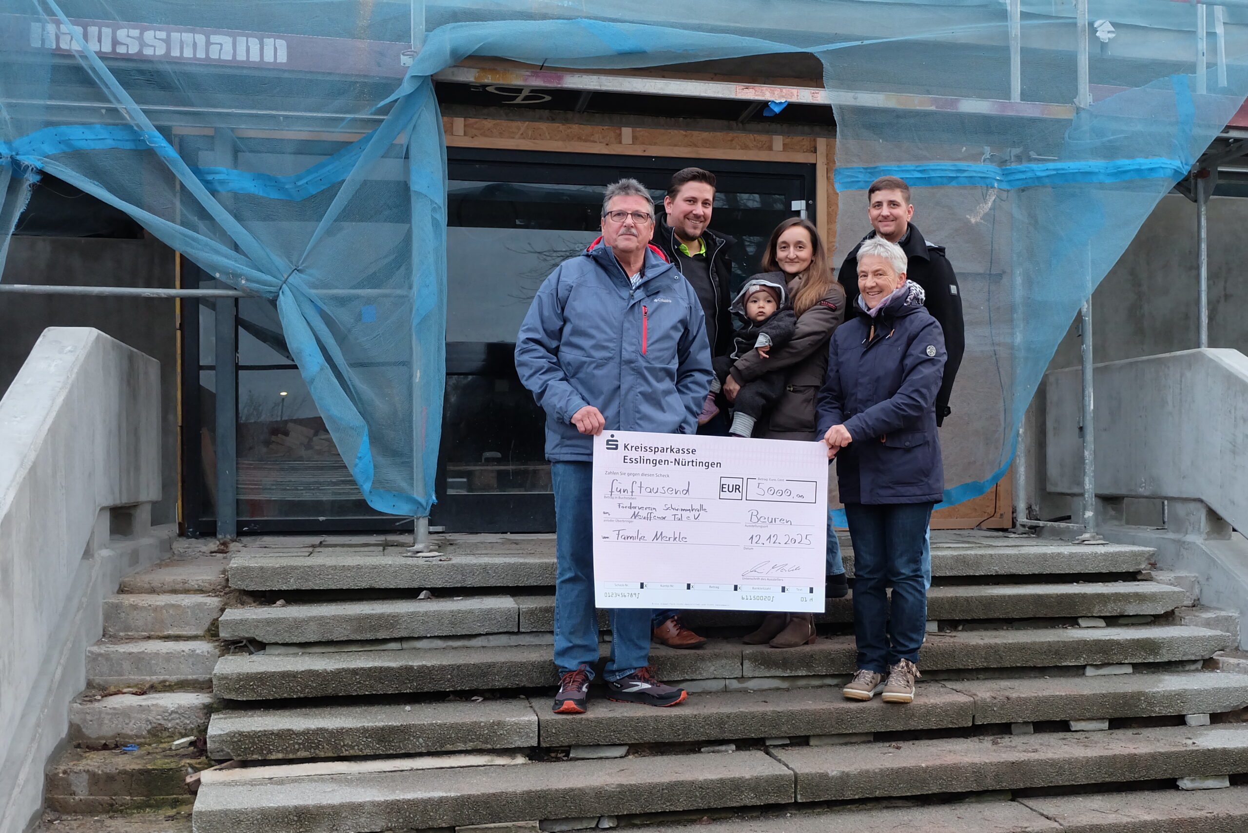 Zum Jahreswechsel ging nochmal eine hohe und sehr erfreuliche Familienspende über 5.000€ bei Förderverein der Schwimmhalle Neuffener Tal ein. Nun folgt noch ein kleiner Bericht mit Bild: Als Einwohner von Beuren und Balzholz, sowie aktive Mitglieder der DLRG-Ortsgruppe Neuffen–Beuren und des Fördervereines „Schwimmhalle Neuffener Tal“ ist es Familie Merkle ein großes Anliegen, dass auch in Zukunft Kinder in der Kleinschwimmhalle schwimmen lernen können. Angelika Merkle, Sportlehrerin der Willi-Gras-Grundschule Beuren, unterrichtet seit 35 Jahren in der KSH schwimmen und hat somit schon unzählige Kindern zu sicheren Schwimmern gemacht. Diese Fertigkeit ist für jeden Menschen lebensrettend. Die Kinder und Jugendlichen aus Beuren und den umliegenden Gemeinden sollen auch weiterhin die KSH als Freizeitangebot, sowie für das Vereinsleben und die Ausbildung der DLRG nutzen können. Die kleine Sophie freut sich schon jetzt darauf in einem frisch sanierten Bad ihren Anfänger-Schwimmkurs absolvieren zu können!