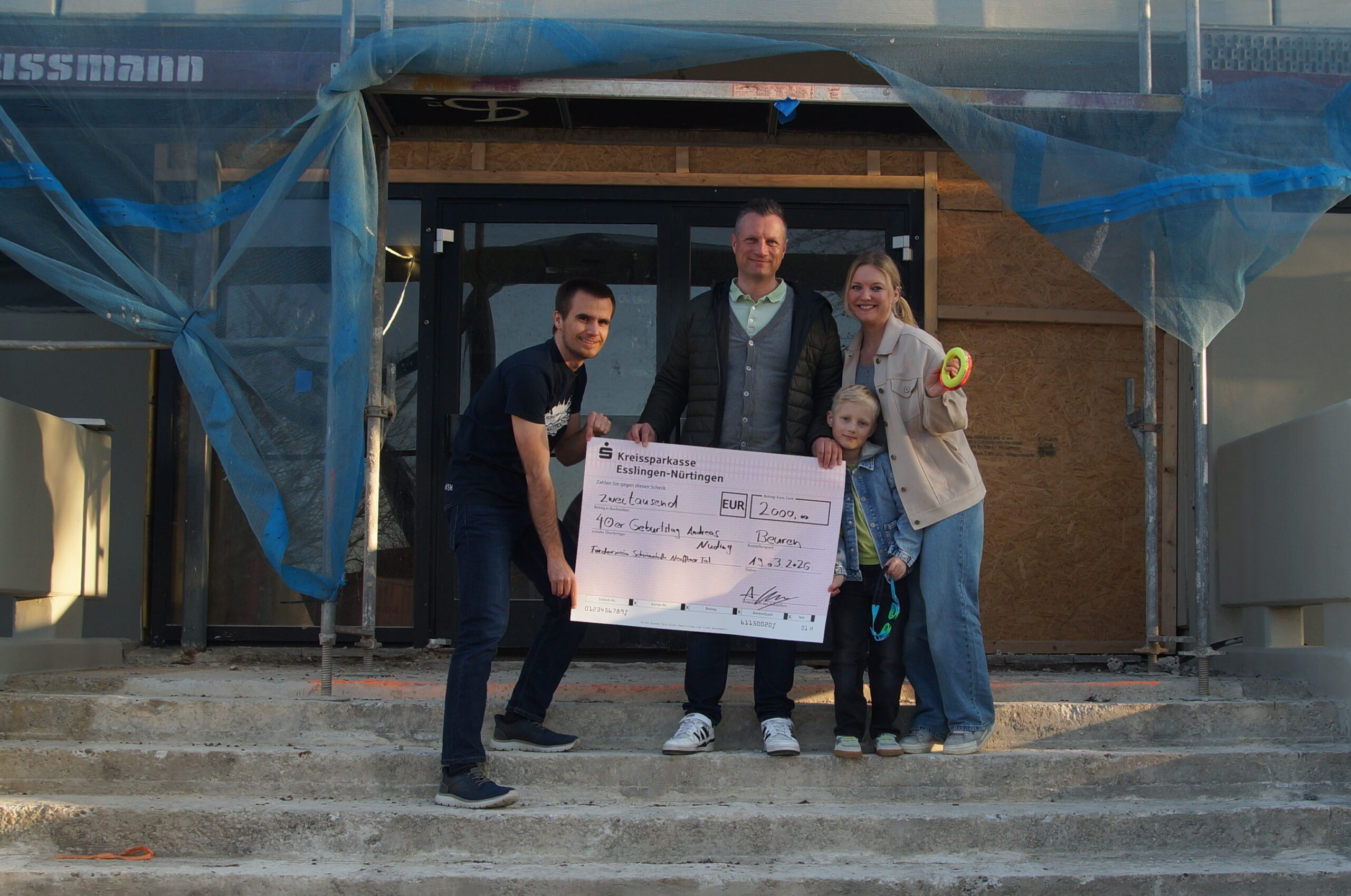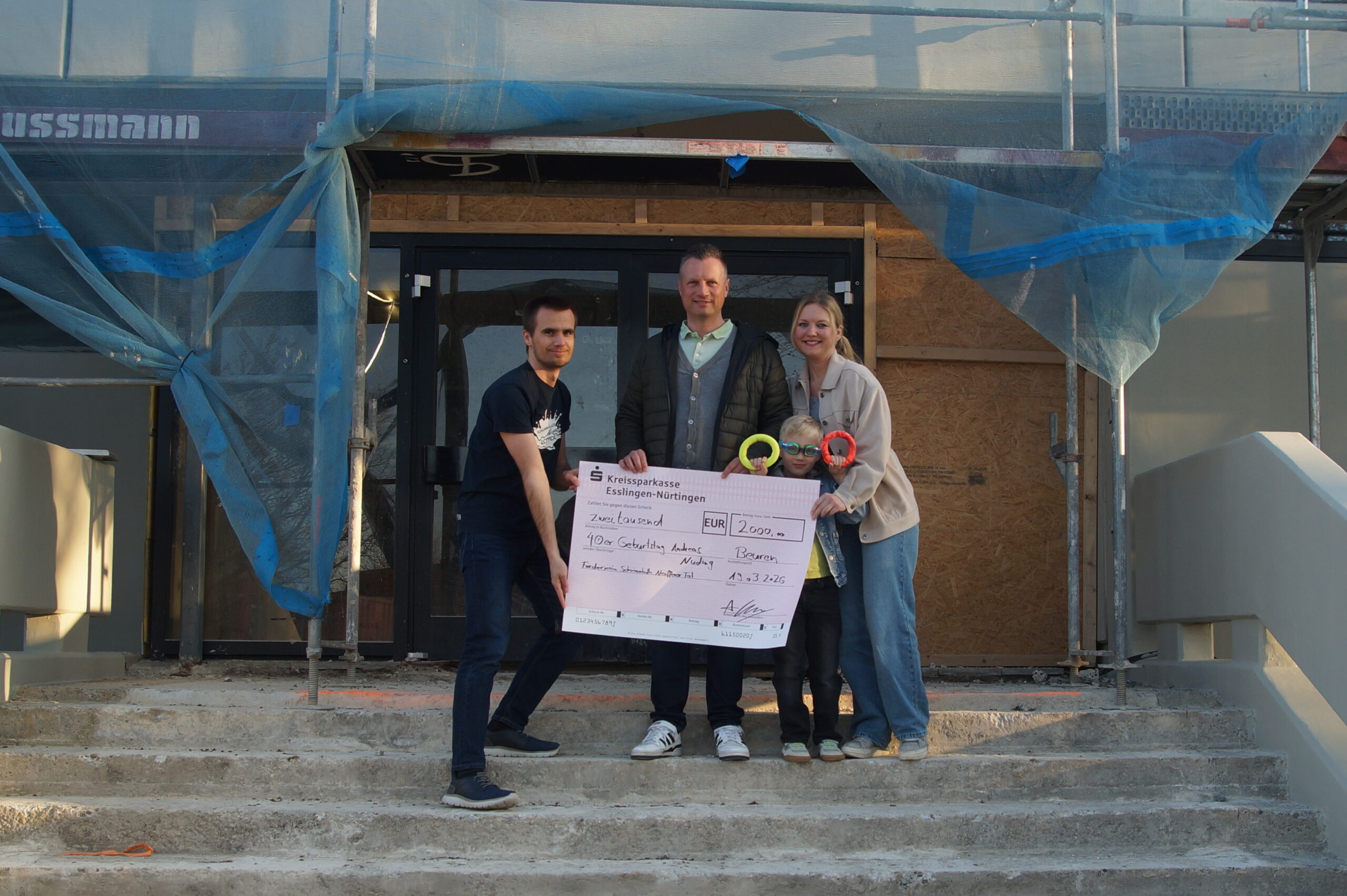 Spende zum 40. Geburtstag: 2.000 Euro für die Zukunft der Kleinschwimmhalle Beuren Große Freude beim Förderverein Schwimmhalle Neuffener Tal e.V.: Am 19. März 2026 durfte sich der Verein über eine ganz besondere Spende in Höhe von 2.000 Euro freuen. Im Rahmen einer symbolischen Scheckübergabe überreichte Andreas Nuding den Betrag, den er anlässlich seines 40. Geburtstags gesammelt hatte. Anstelle von persönlichen Geschenken bat Andreas Nuding seine Gäste darum, einen Beitrag für den guten Zweck zu leisten – mit großem Erfolg. Die gesammelte Summe kommt nun direkt der Sanierung der Kleinschwimmhalle Beuren zugute. „Die Schwimmhalle ist ein wichtiger Bestandteil unserer Region – insbesondere für Kinder und Jugendliche“, betont der Spender. Sein persönliches Anliegen ist es, die Schwimmhalle als Ausbildungsstätte für den Nachwuchs zu erhalten und zu stärken. Gerade Schwimmkurse für Anfänger seien heute wichtiger denn je. Auch sein Sohn soll künftig von einem attraktiven und sicheren Angebot vor Ort profitieren können. Der Förderverein bedankt sich herzlich für dieses außergewöhnliche Engagement. Solche Initiativen zeigen, wie viel durch persönliche Ideen und gemeinschaftlichen Einsatz bewegt werden kann.