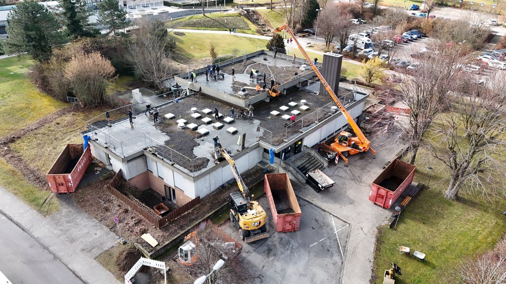 Bereits letzte Woche wurde mit den Vorbereitungen für die Aktion gestartet. Schließlich musste das Dach sicher betretbar sein, wenn es zum „Arbeitsplatz“ für so vielen Helfer wird. Vielen Dank daher an dieser Stelle an Thomas Oswald für die Bereitstellung des Treppenaufgangs auf die beiden Ebenen des Flachdachs und das Bauunternehmen Klaß, das die Bauzähne für die Absturzsicherung bereitgestellt und dank Kran auch direkt auf dem Dach abgeladen hat.