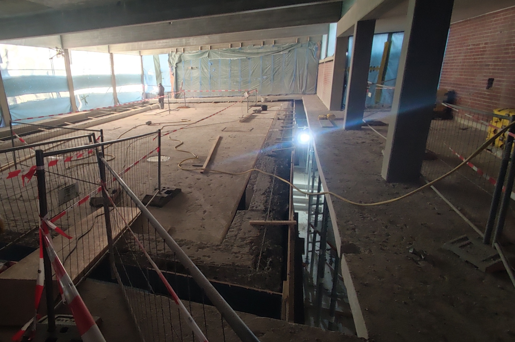 Es geht weiterhin voran in und um die Kleinschwimmhalle. Mittlerweile sind die meisten Arbeiten am Rohbau abschlossen: die Betonwände sind wieder ganz und der Armierungsstahl ist nicht mehr zu sehen. Dafür hat sich rund um das Becken ein größeres Loch aufgetan – auch hier muss der Beton, teilweise großflächig entfernt werden und wird jetzt komplett erneuert. Unterdessen wurden auch die Türdurchgänge verbreitert und den heutigen Anforderungen gerecht umgesetzt. Wenn die letzten Arbeiten am Rohbau vollends abgeschlossen sind, geht es an die Installationen und den Aufbau. Dann werden die jetzt leeren Räume wieder mit Leben gefüllt!
